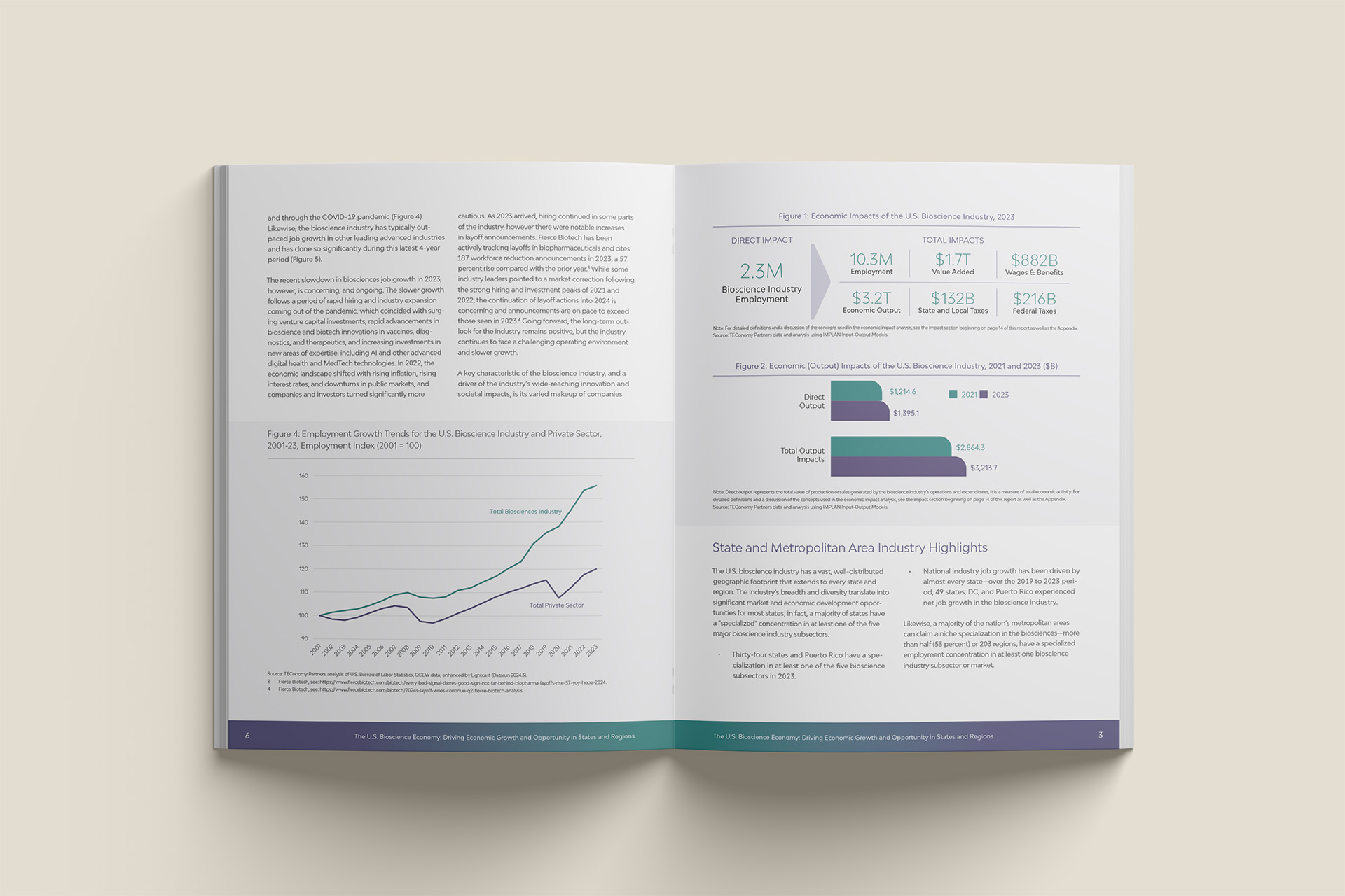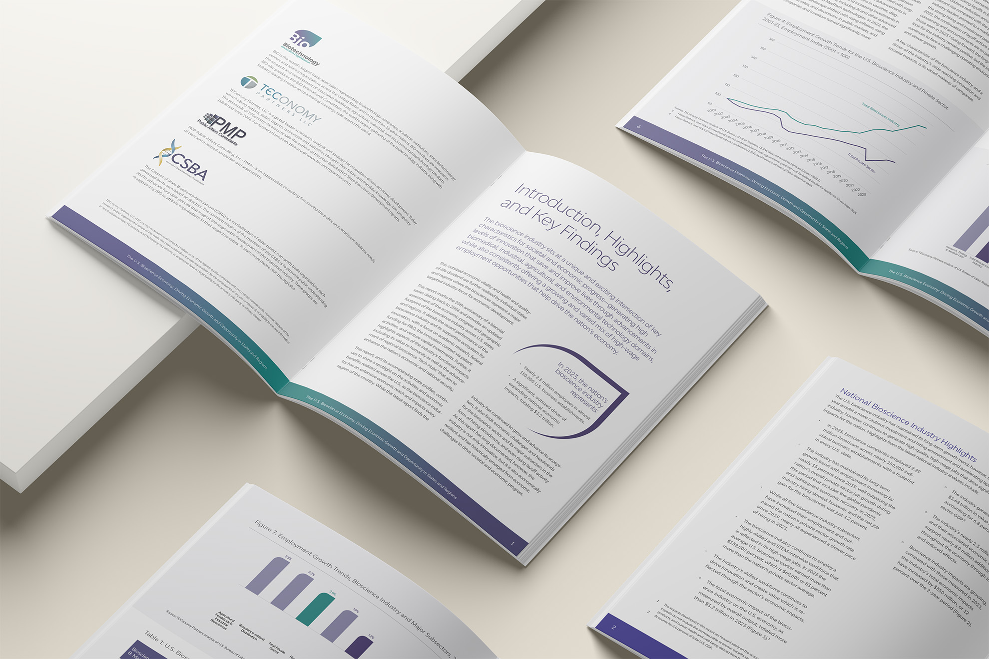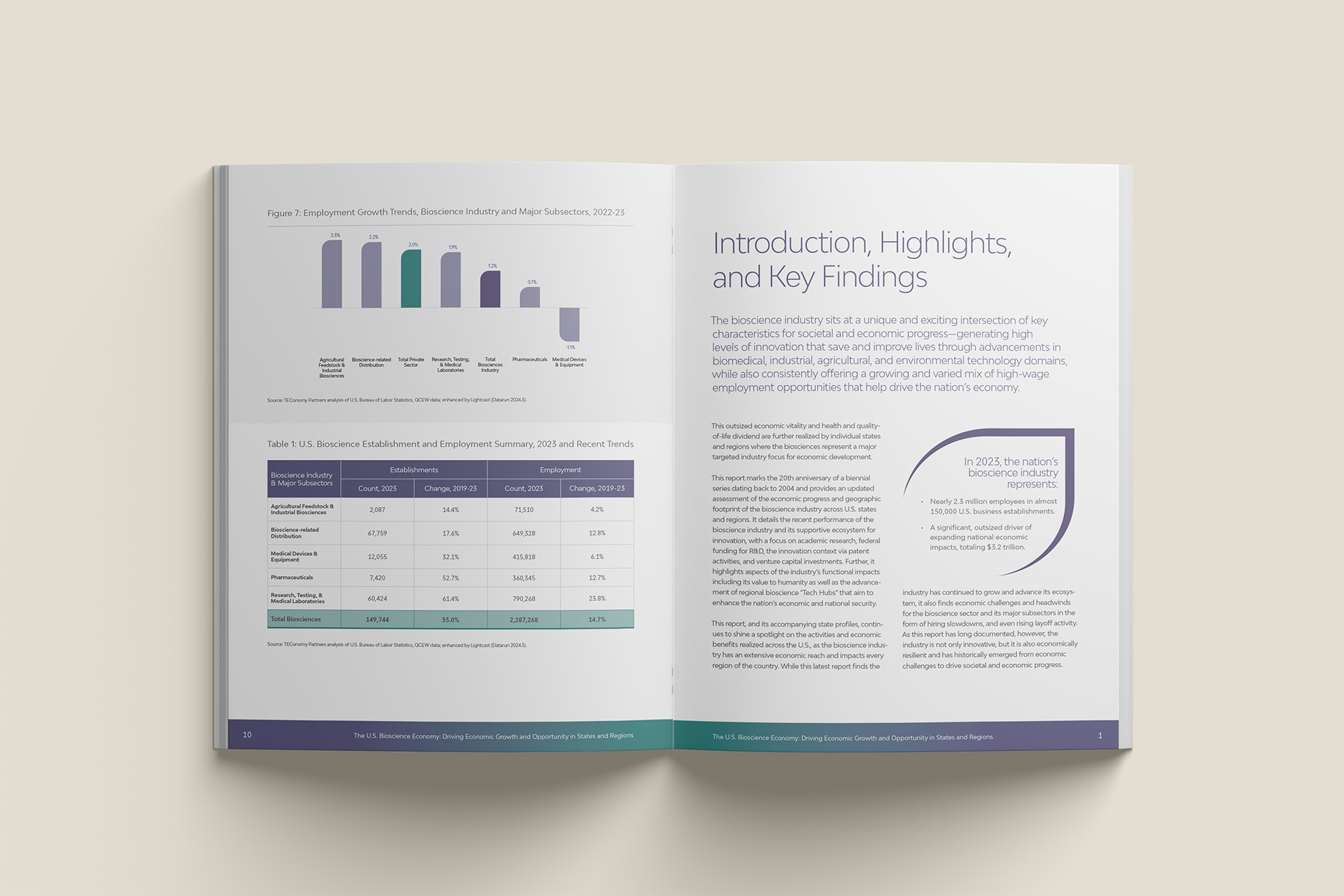 The 11th edition of the BIO/TEConomy report focuses on the economic footprint of the industry geographically, including the latest trends in the bioscience industry for the nation, states, and metropolitan areas. My goal was to turn complex economic data into clear, visually compelling layouts that are both engaging and easy to digest. I have been designing this biannual report for the BIO Conference since 2018.